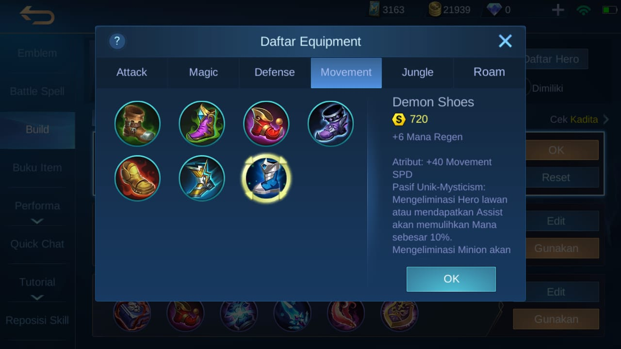 Item yang pertama yang harus dibeli Kadita adalah Demon Shoes. Item Movement ini akan memberikan Mana Regen dan Movement Speed. Dengan membeli item ini maka Kadita tidak akan terlalu boros Mana.